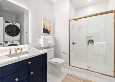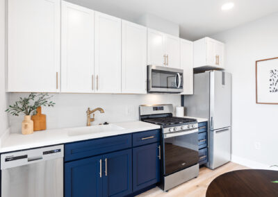Striking Dark Navy and White Cabinetry with Champagne Bronze Pulls